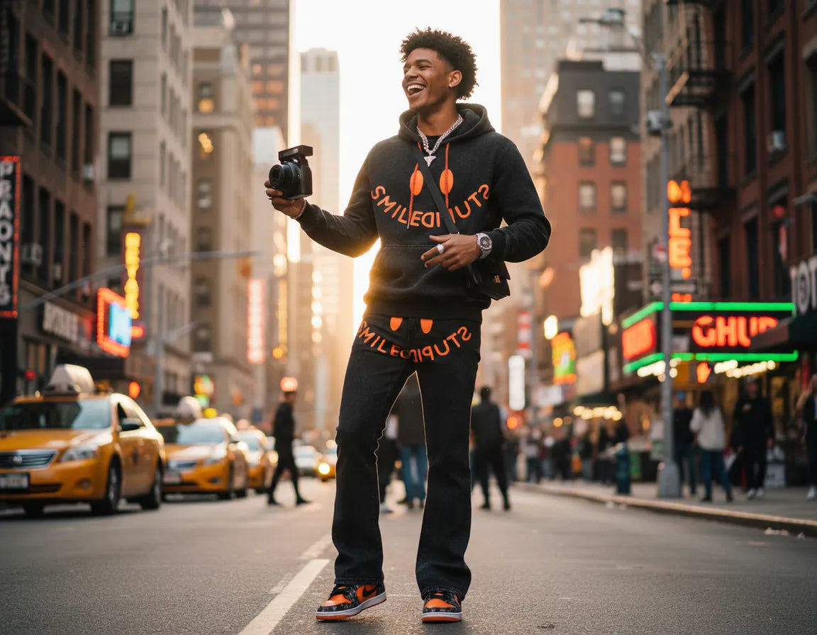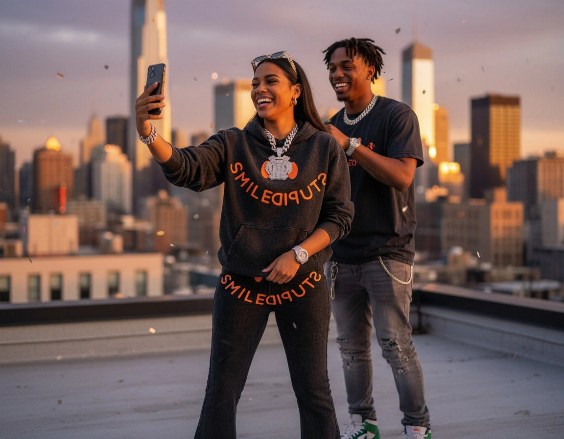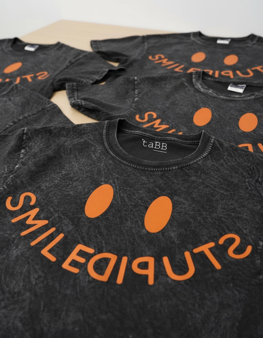 Black Acid Wash Hoodie with Orange SMILESTUPID logo + Black Acid Wash Shirt with Orange SMILESTUPID logo + Black Acid Wash Sweatpants with Orange SMILESTUPID logo